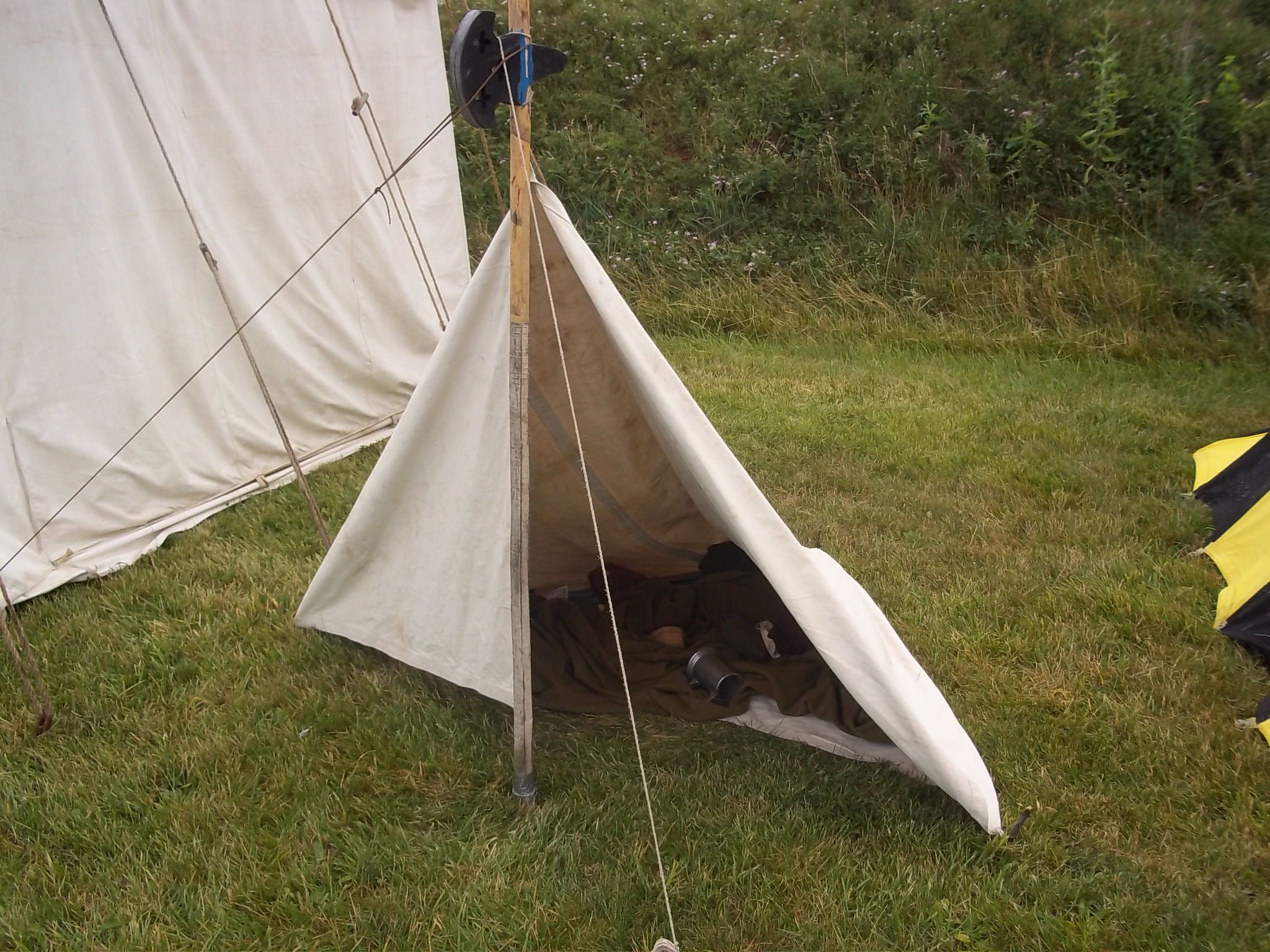 The first tent I made! Interesting concept to use a weapon as my pole, but not practical for American reenacting. ca 2013